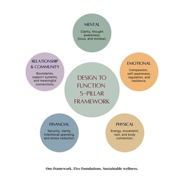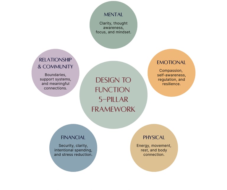 A gentle introduction to the Design to Function 5-Pillar Framework — designed to help you slow down, clear mental clutter, and realign with what truly matters.